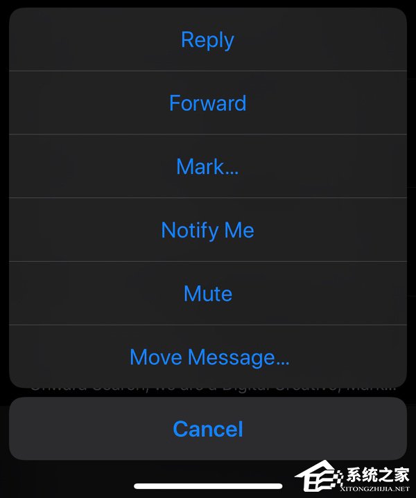 现在你在邮件App中划动某个邮件条目并点击“更多”按钮后发现弹出菜单里会新增一个“静音”按钮。点击后该邮件序列的后续新邮件将不会再发送提醒。