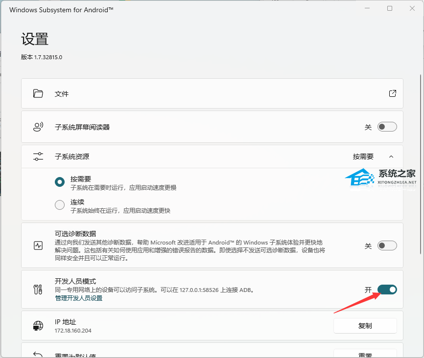 4、打开Window Subsystem for Android应用开发人员模式;