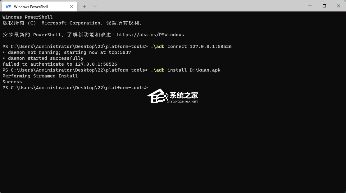输入”.\adb install D:**.apk“,安装下载的app;