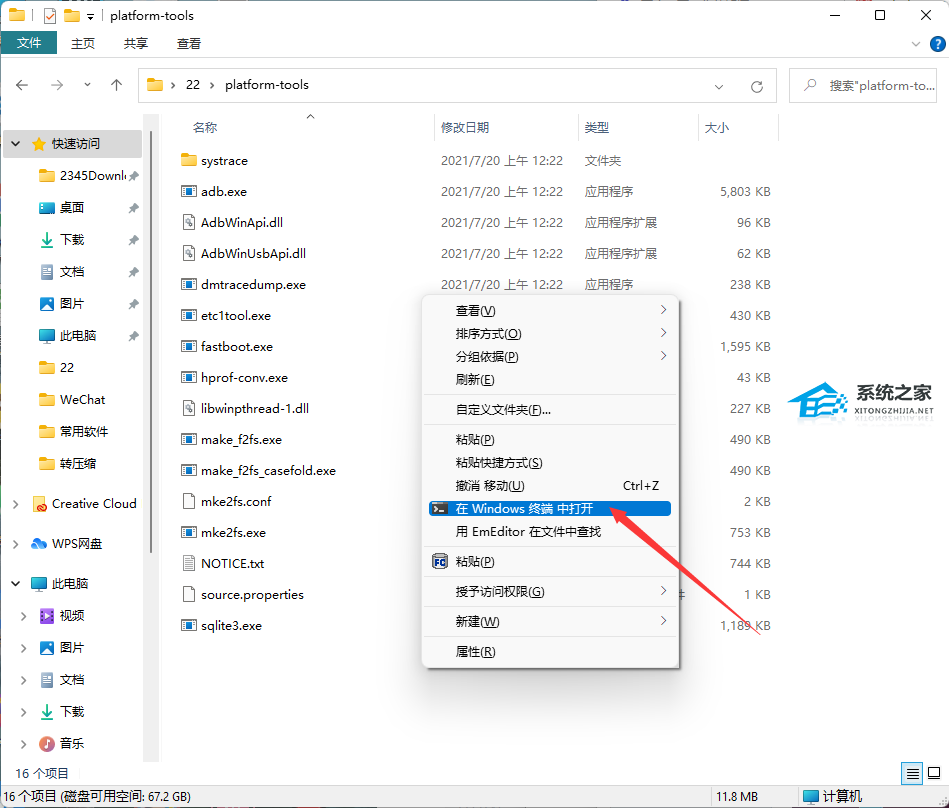 · 解压ADB(platform-tools-latest-windows.zip),在解压后的目录右键选择”在Windows终端中打开“;