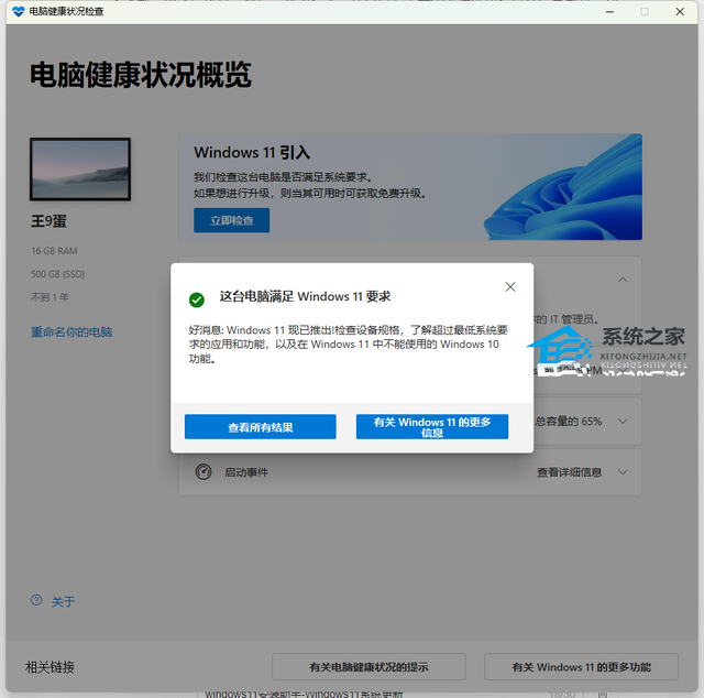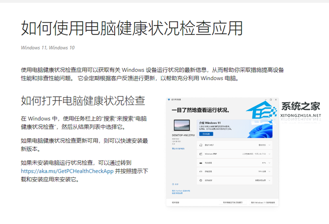 点击蓝色链接获取电脑健康状况检查应用,并运行。然后点击立即检查。