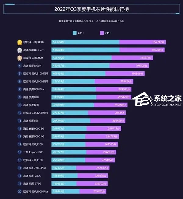 从排行榜可以看出,第一名为联发科天玑9000+处理器,第二名则为高通骁龙8+ Gen1处理器,这两款处理器可以说旗鼓相当的,在Gpu方面,高通骁龙8+ Gen1稍微强点,而在CPU方面,联发科天玑9000+相对较强,整体表现应该是差不多的。
