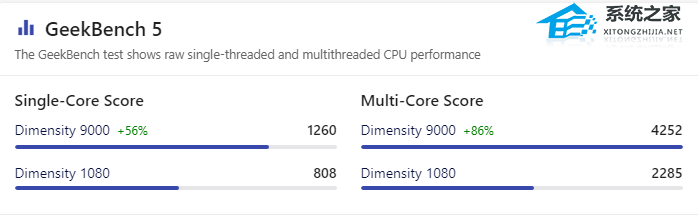 从Geekbench5的跑分来看,天玑9000的性能都是大幅度高于天玑1080的,天玑9000是高端芯片,而天玑1080是中端芯片。