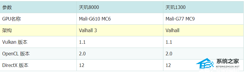 天玑8000采用了更新的Mali-G610 MC6架构,天玑1300依旧使用前两代的Mali-G77 MC9架构。