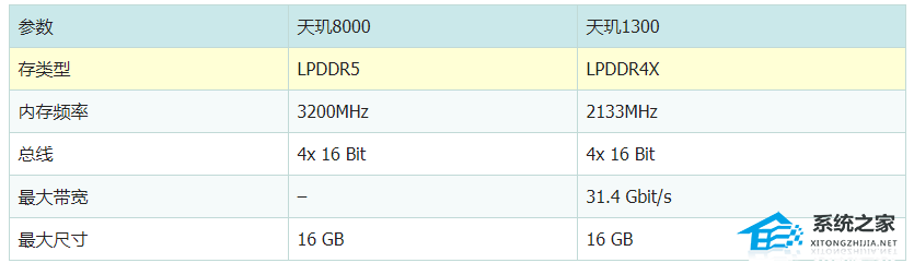 在内存方面天玑8000最新的3200MHz主频,LPDDR5内存。天玑1300依旧只支持LPDDR4x内存,同时频率也只有2133Mhz 。