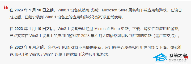 系统之家消息,Win8.1 系统将于明年 1 月正式退出历史舞台,微软再次发出提醒,敦促 Win8.1 用户尽快升级到 Win10 或 Win11 系统,虽然在 Win8.1 停止支持后,运行该系统的设备仍然可以继续运行,但微软将不再提供更新,今后用户遇到漏洞则束手无策。此外,微软的客户服务将不再提供 Win8.1 的技术支持。那么在 Win8.1 停止支持之后,软件和游戏会有什么影响?