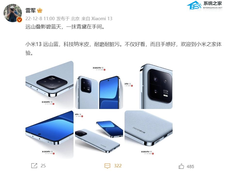 相信有很多小米爱好者对于小米13的外观和配色都非常的好奇,而据系统之家12月8日最新消息,小米创办人、董事长兼CEO雷军已于今日上午公布了小米13远山蓝配色官图,下面就让我们一起来看看吧。