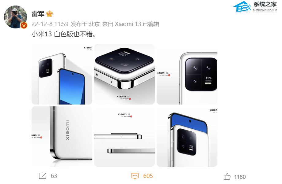 随后,雷军还公布了小米 13 白色版本官图,称“白色版也不错”。