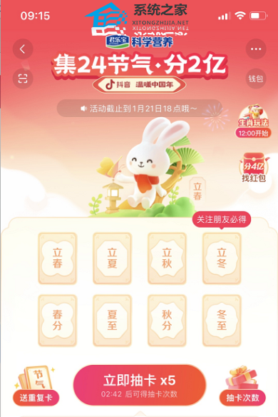 2、1月10日活动正式开启后,进入到“集24节气 分2亿”页面,即可找到对应的抽卡活动位置,玩与往年有所改变,用户需要集齐春、夏、秋、东等不同的季节卡,即可获得4倍的红包奖金。