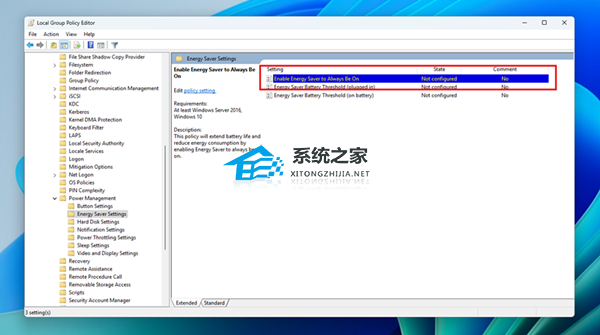组策略方面,管理员可以通过“计算机配置-管理模板-系统-电源管理-节能设置”路径,配置“Enable Energy Saver to Always Be On”选项。