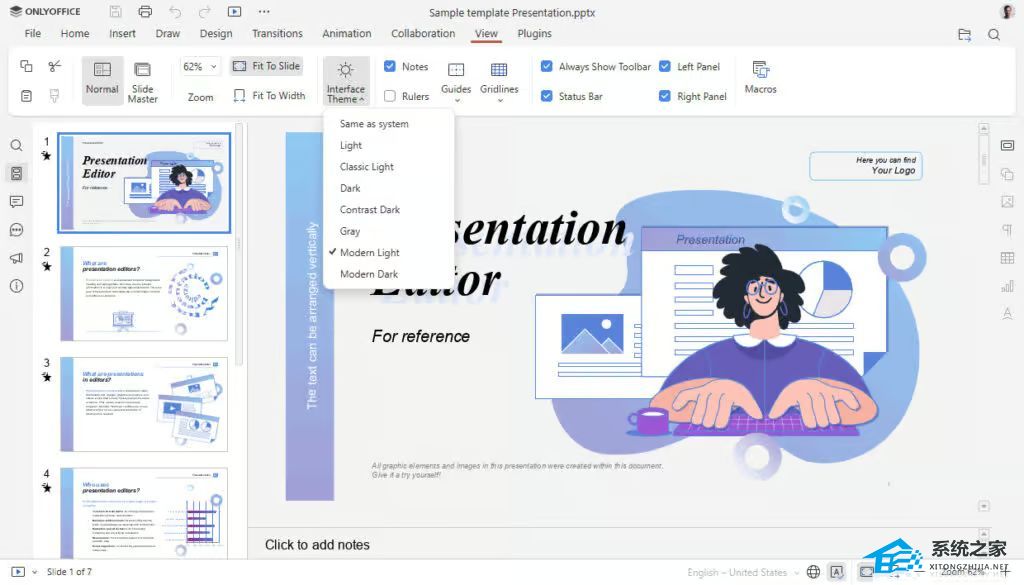在界面上,ONLYOFFICE 9.0 优化 PDF、Document、Spreadsheet 和 Presentation 编辑器界面,优化布局,进一步提升操作直观性。用户还可以根据偏好,在“视图”中切换“现代浅色”或“现代深色”主题。