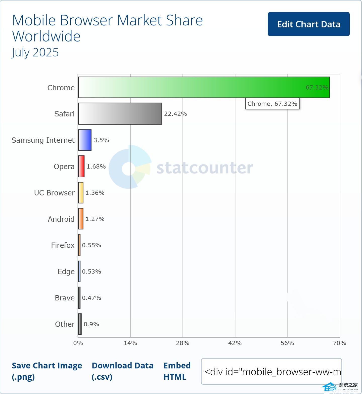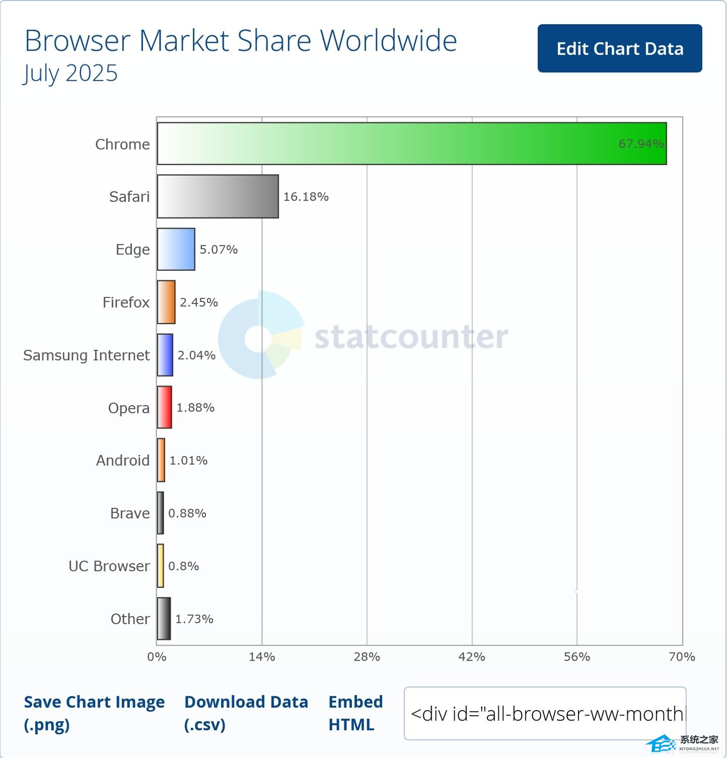 系统之家 8 月 1 日消息,2025 年 7 月浏览器市场份额报告已发布。全球范围内,谷歌 Chrome 浏览器以 67.94% 的市场份额稳居第一,苹果 Safari 浏览器以 16.18% 位居第二,微软 Edge 浏览器以 5.07% 位居第三。这些数据显示了当前浏览器市场的竞争格局。