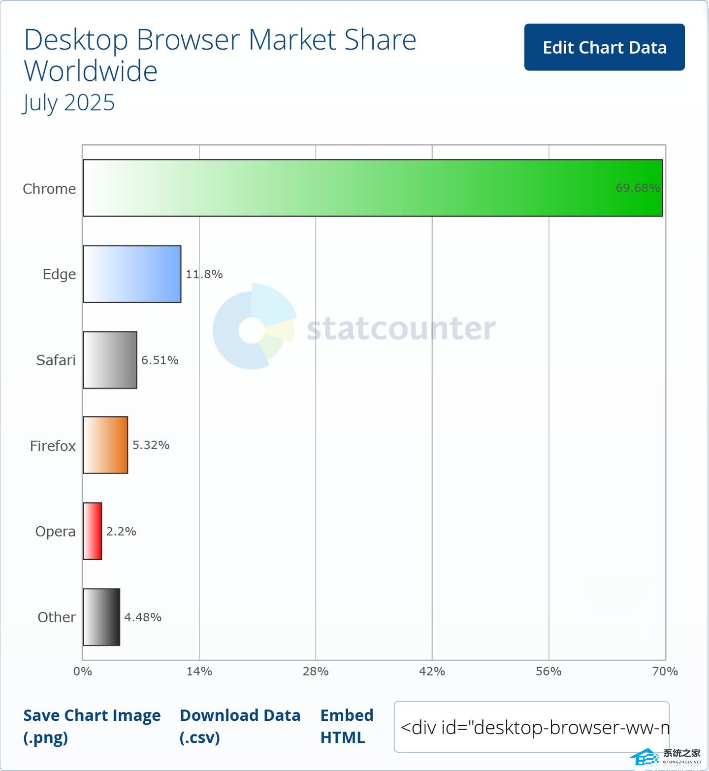 Chrome 在 7 月凭借 69.68% 的全球份额排名第一,相比上个月(66.59%)增加 3.09 个百分点。