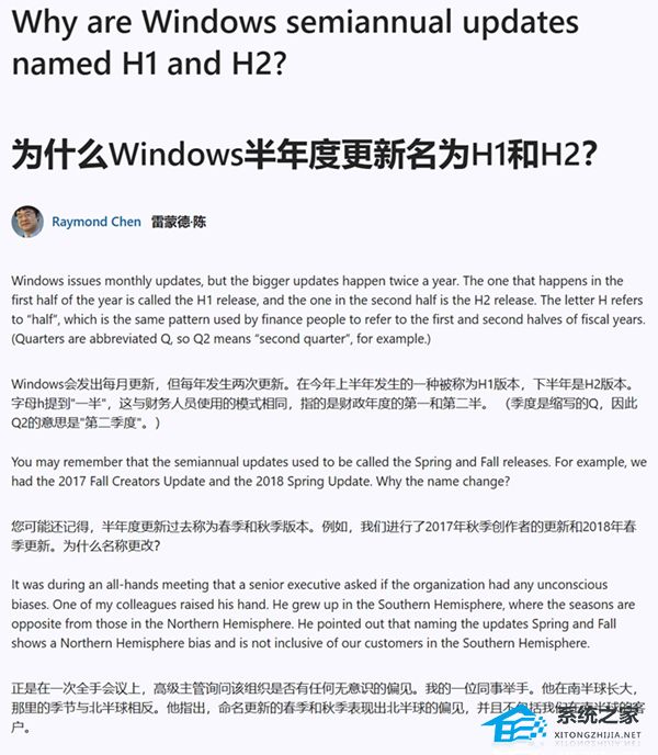 系统之家 8 月 6 日最新消息,微软的资深开发者 Raymond Chen 于昨日(8 月 5 日)通过其博客透露了微软为何放弃“春季更新”、“秋季更新”等名词的原因,而是改为更常规的年份命名方法,下面就一起来看看吧。