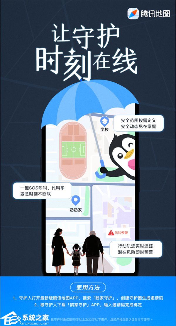 系统之家 8 月 20 日消息,腾讯地图近日上线“鹅家守护”功能,支持用户实时查看老人和孩子的位置及状态。无论身处何地,都能第一时间了解老人和孩子的动向。同时,“鹅家守护”功能还支持用户设置安全区域,一旦偏离,系统即刻预警,真正实现提前预警与及时响应。