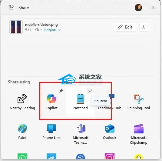 Windows 分享界面则支持将常用应用固定在“使用以下方式分享”区域。