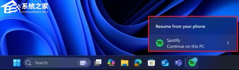 本次更新引入了全新的“安卓应用接力”功能。用户在安卓手机上运行应用(如 Spotify)时,电脑任务栏会弹出“续用提醒”,可直接在电脑端打开并继续原先的内容。