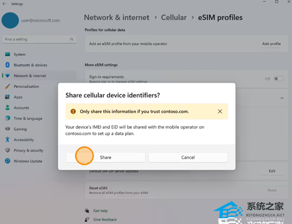 在 Windows 11 中,微软已经在设置应用中集成了相关功能。在用户同意向运营商共享设备标识符后,无需手动输入信息,系统即可自动完成 eSIM 配置。