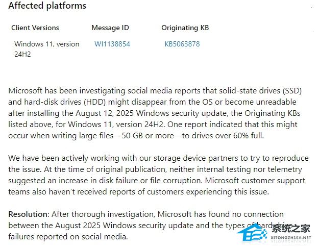 经过深入调查,微软未发现 2025 年 8 月 Windows 安全更新与社交媒体上所报告的硬盘故障类型之间存在关联。我们会像以往一样,在每次 Windows 更新发布后持续监测用户反馈,并对未来的报告进行调查。