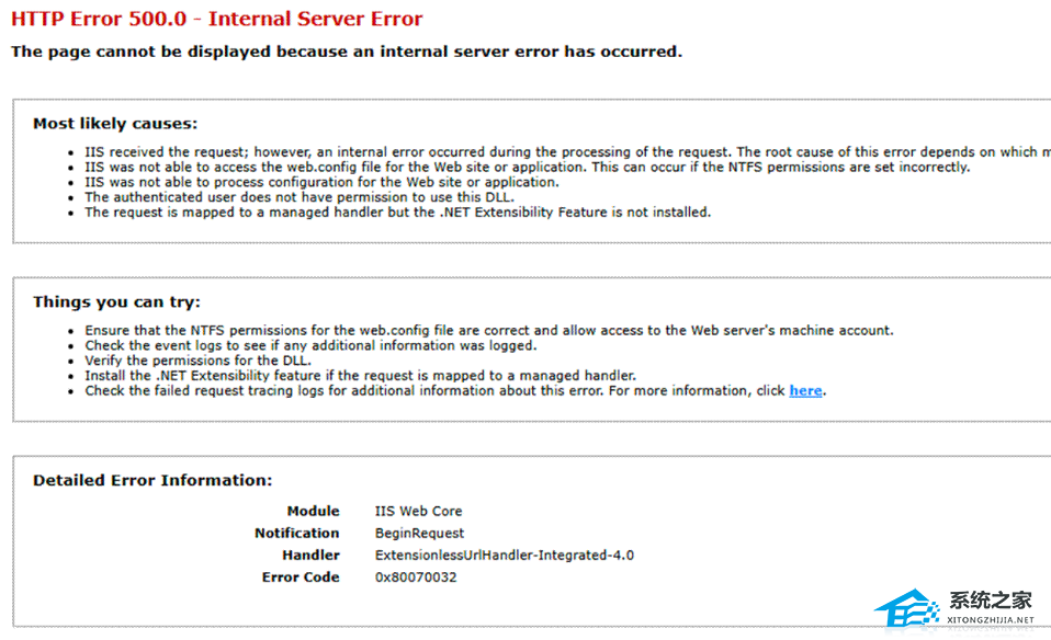 而在 24H2 版本和 Server 2025 中,IIS 会返回 500.0 服务器内部错误并附带错误代码 0x80070032(意为“不支持”)。