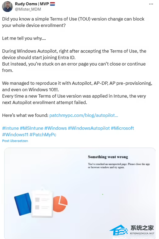 近期有管理员反馈,在部署过程中选择同意最新 TOU 时,AutoPilot 会立即卡死,屏幕显示“Something went wrong: You accessed an unexpected page”错误,部署无法继续。这一问题出现在 Windows 10 与 Windows 11 的自动部署中,且在多台设备上已复现。