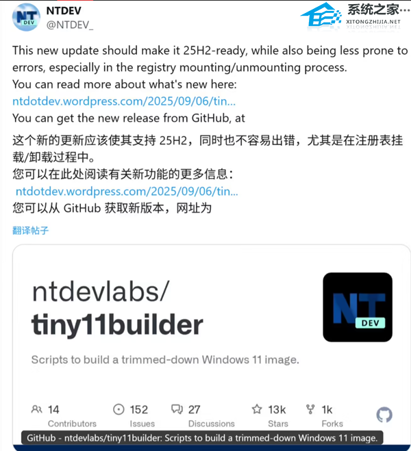 系统之家援引博文介绍,9 月新版 tiny11builder 主要提升兼容性,兼容包括 Windows 11 25H2 在内的所有 Windows 11 版本,并支持各种语言和硬件架构,主要依赖改进的 PowerShell 脚本实现更高效处理。