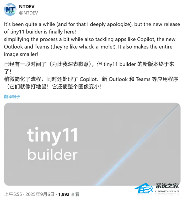 系统之家 9 月 8 日最新消息 Win11 系统精简工具 tiny11builder 发布的了最新的九月更新,此次更新不仅能够支持最新的 25H2 版本系统,而且还增加移除 Copilot、Outlook for Windows 及 Teams 等组件的功能,能够减少更大的空间。