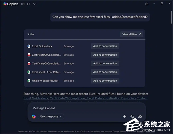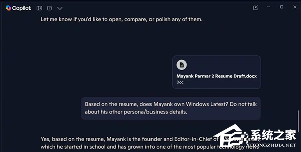 例如,选择打开 Word 文档,系统便会启动默认应用。而“附加到提示”可将文件直接放入输入框,通过调用 Copilot 进一步 AI 分析。