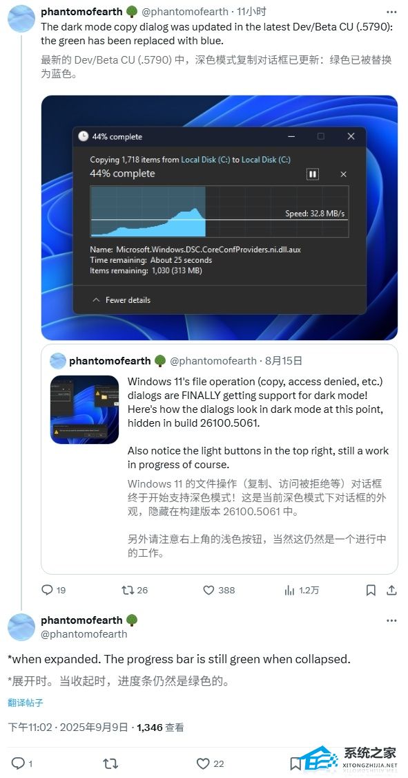 系统之家 9 月 10 日消息,微软正对 Win11 的复制/粘贴对话框进行优化,新增了深色模式支持。公开资料显示,Windows 系统的复制 / 粘贴对话框界面自 2012 年 Windows 8 时代沿用至今,十余年未做大幅调整。