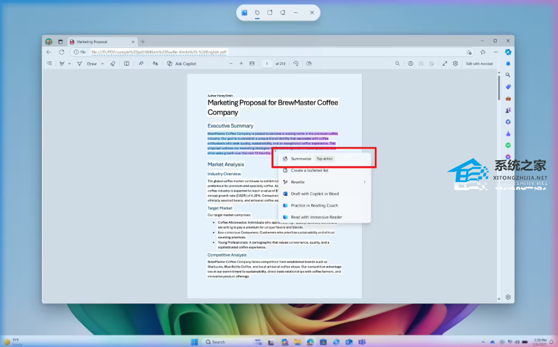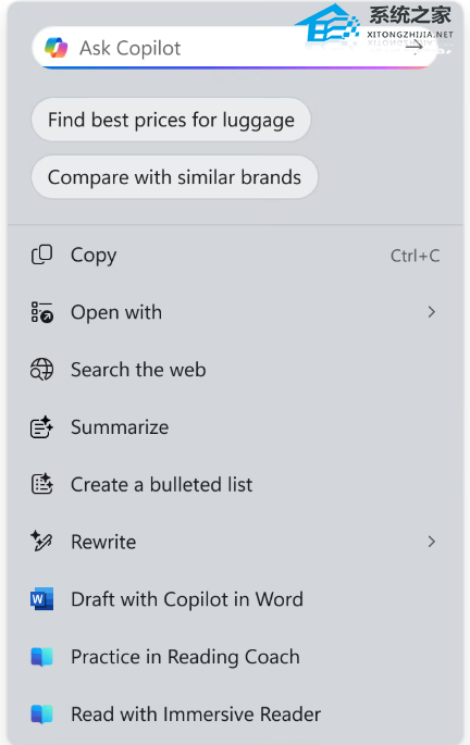 Copilot 提示框:Click to Do 中全新的 Copilot 提示框旨在简化用户与 Microsoft Copilot 的交互。此项增强功能有助于节省时间,并允许用户直接在文本框中输入自定义提示,然后该提示会与屏幕上所选内容一起发送到 Copilot。建议的提示也会显示在文本框下方,由 Phi-Silica 本地支持(仅支持文本选择,以及英语、西班牙语和法语)。此项更改尚未推广至 EEA(欧洲经济区)或中国的 Windows Insider 成员。