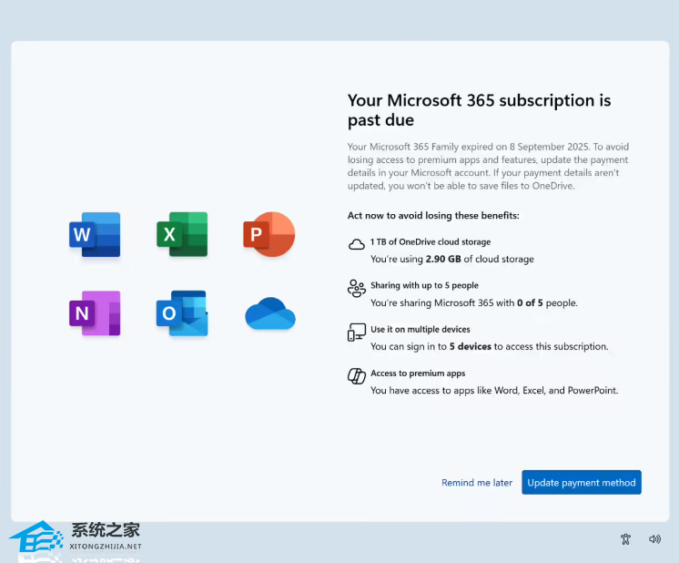 微软推出了一个简单的提醒功能,它会以 SCOOBE 屏幕(第二次开箱即用体验)的形式出现,提醒您您的 Microsoft 订阅需要注意(例如,如果续订付款未成功)。只需点击几下,您就可以查看并更新您的付款方式,并确保您的订阅权益不中断。