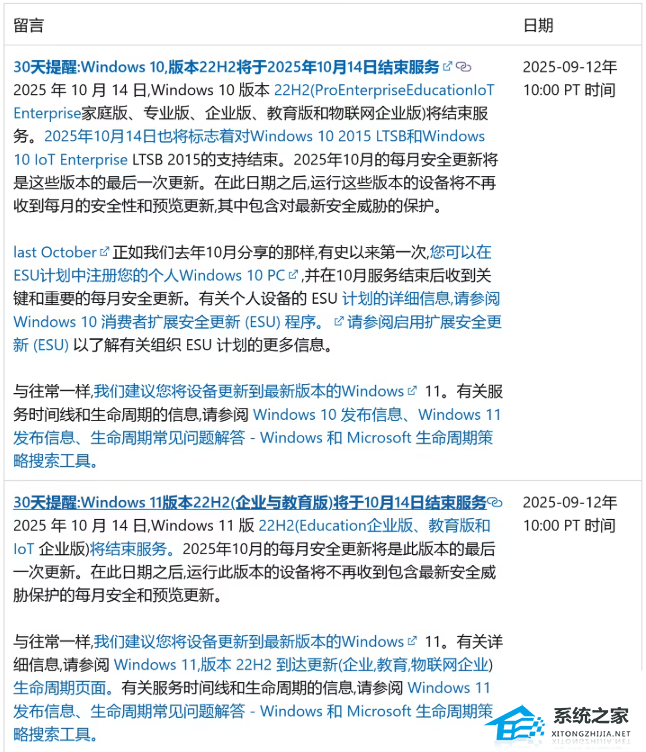 微软强调 Windows 10 家庭版、专业版、企业版、教育版和物联网企业版在内的 22H2 版本将不再接收安全更新、错误修复或技术协助。