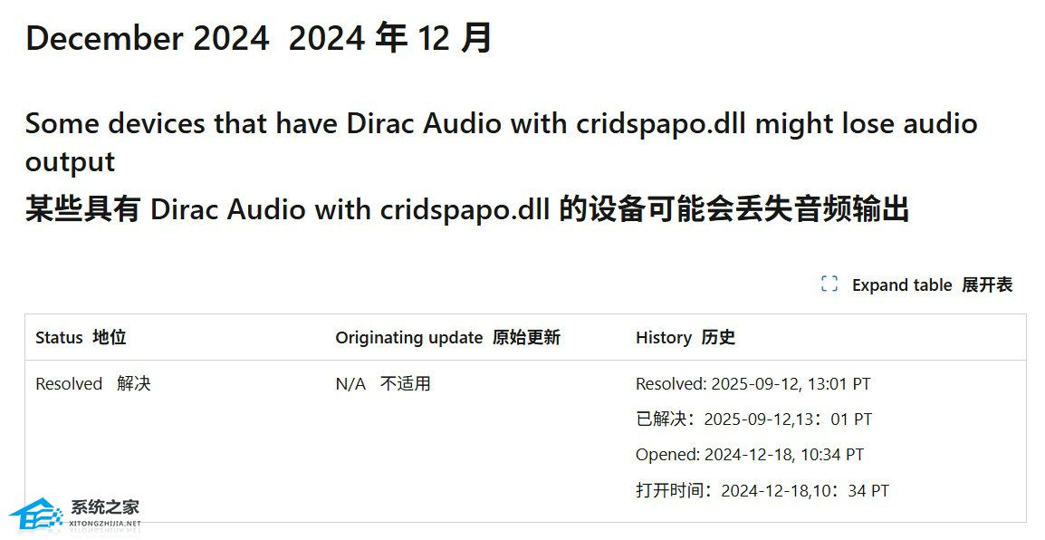 系统之家注:微软于 2024 年 12 月承认该问题,源于 Dirac 音频软件不兼容 Win11 24H2 系统,导致音频输出中断。