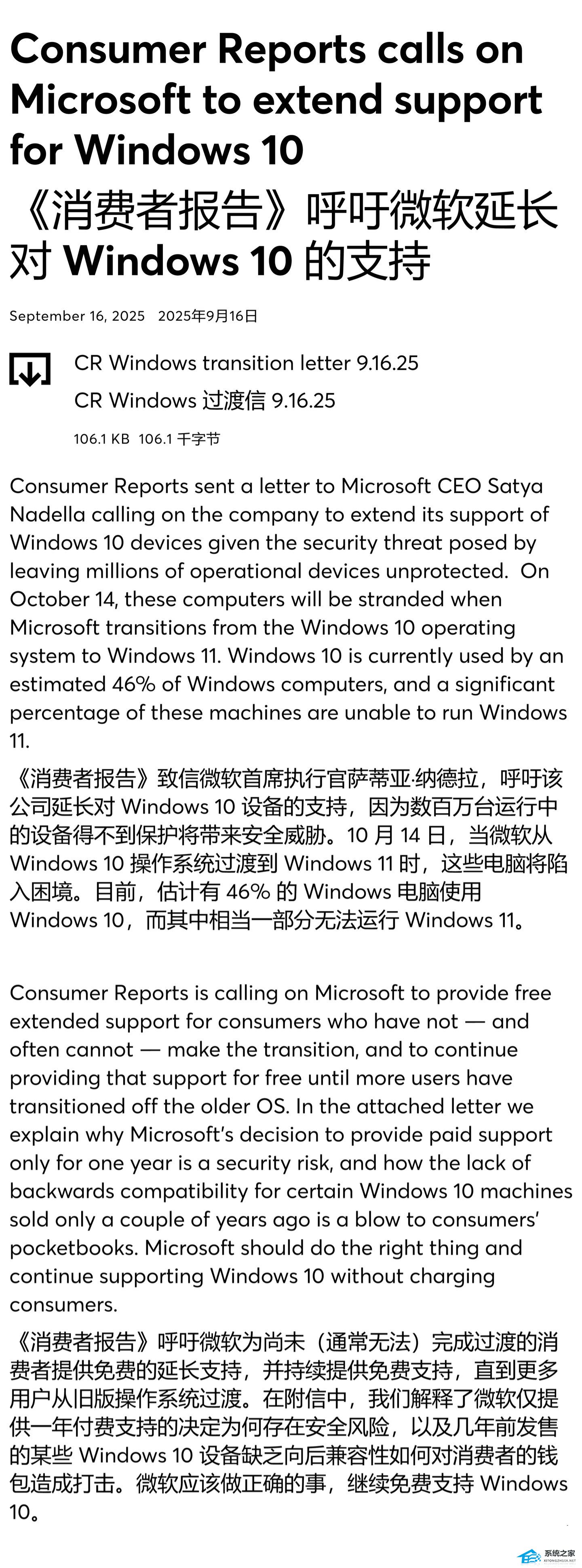 系统之家 9 月 17 日消息,美国消费者权益组织“消费者报告”(Consumer Reports)致信微软首席执行官纳德拉(Satya Nadella),要求延长 Win10 系统的免费安全更新期限。按照微软现行计划,Win10 将在 2025 年 10 月 14 日结束免费安全更新,那么全球将有 2 亿至 4 亿台仍在运行该系统的电脑直接暴露在安全风险中。