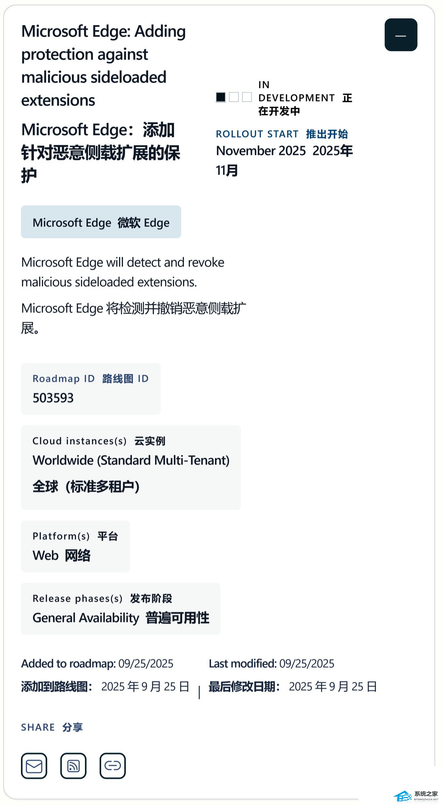 系统之家 9 月 26 日消息,微软正为 Edge 浏览器开发针对侧载扩展的安全防护新功能,能自动检测并移除恶意的“侧载扩展”(即从非官方商店安装的扩展)。据 Microsoft 365 路线图显示,该功能目前处于 “正在开发中” 阶段,预计将于 2025 年 11 月正式向所有用户推送。