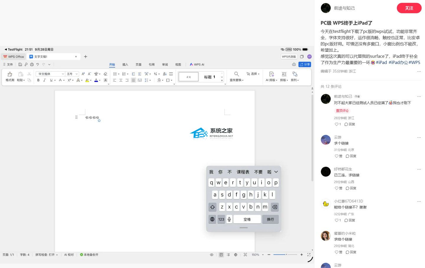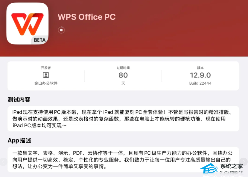 系统之家 9 月 29 日消息,近日,金山办公正式开启 WPS PC 版在苹果 iPad 设备的测试通道,版本号为 12.9.0 Build 22444。用户需通过苹果官方测试工具 TestFlight 参与体验,目前测试名额已宣告满员。
