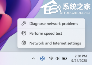 网络图标菜单选项:包括诊断网络问题、执行速度测试和网络及互联网设置。