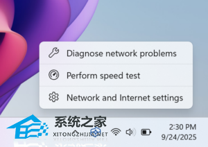 网络图标菜单选项:包括诊断网络问题、执行速度测试和网络及互联网设置。