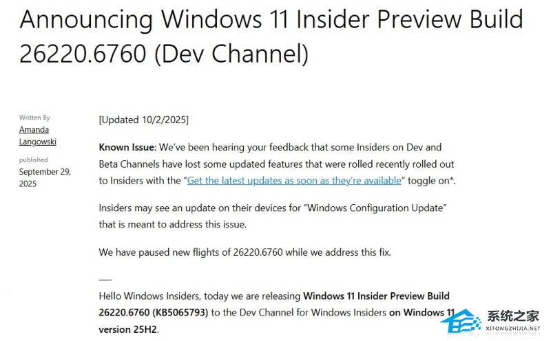 系统之家 10 月 3 日最新消息,微软宣布暂停推送 Windows 11 25H2 Build 26220.6760(KB5065793) 预览版更新,问题表现在系统中部分新功能在上线后意外消失。主要影响参与 Dev 和 Beta 渠道测试。在查明根本原因并完成修复前,将停止该版本的分发。