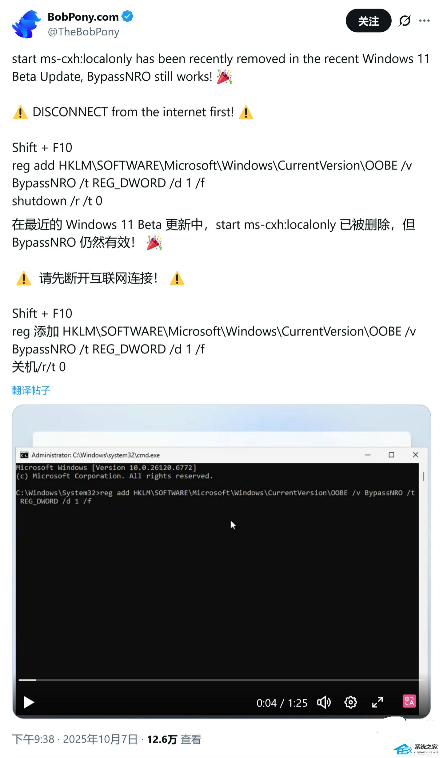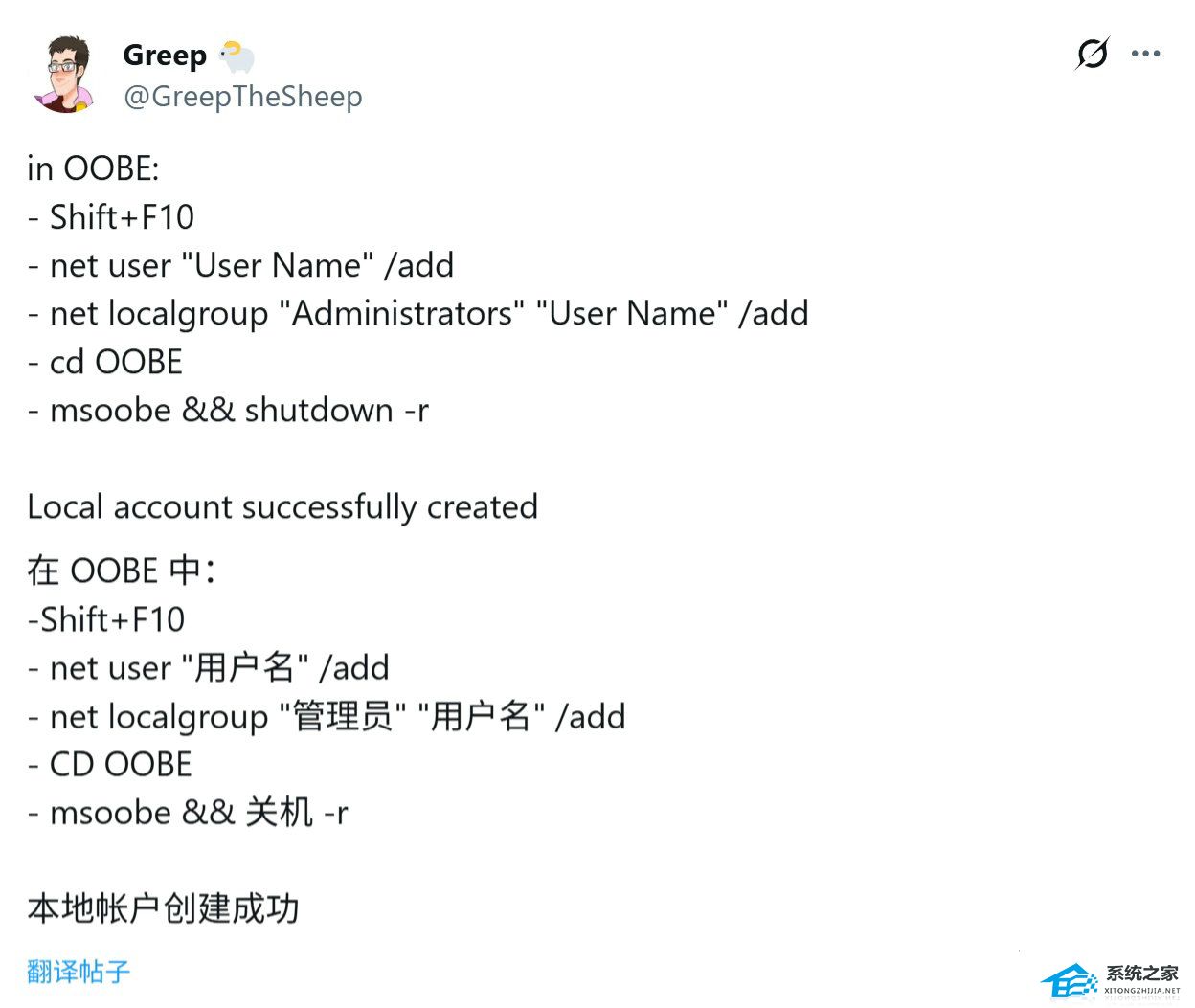 另一位用户 @GreepTheSheep 也分享了绕过微软限制,继续创建本地账号的方法: