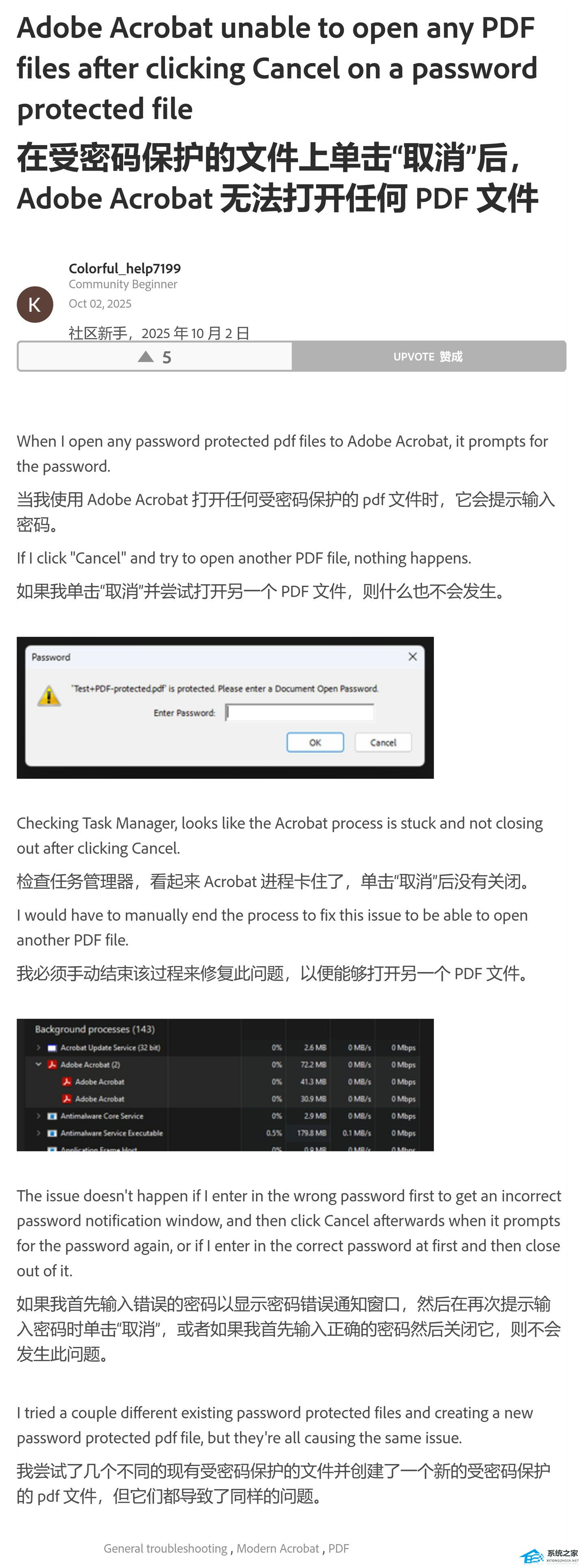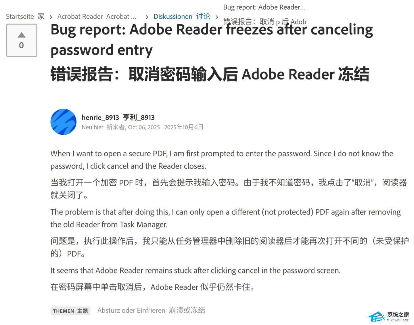系统之家 10 月 10 日最新消息,近日,Adobe Reader 25.001.20756 版被曝出存在严重 BUG。不少用户反馈,在使用该版本软件打开受密码保护的 PDF 文件后,点击“取消”选项后软件就会卡死,无法进行后续操作。