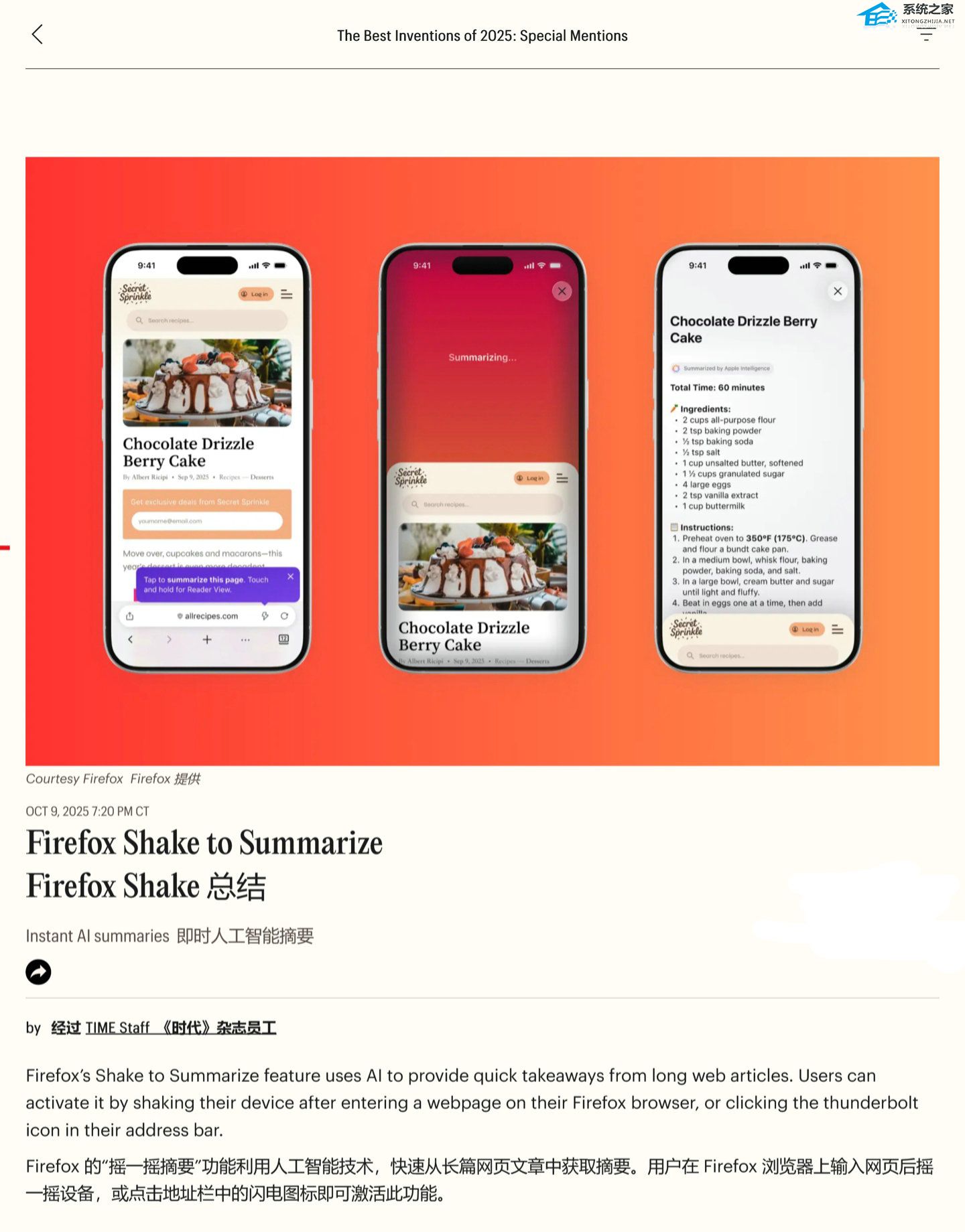 系统之家 10 月 10 日最新消息,《时代》杂志近日揭晓了 2025 年度最佳发明榜单,火狐 Firefox 浏览器的 “摇一摇总结”(Shake to Summarize)功能成功入选 “特别提及” 类别。目前该功能仅限于系统语言设置为英语的美国地区 iOS 用户开放。