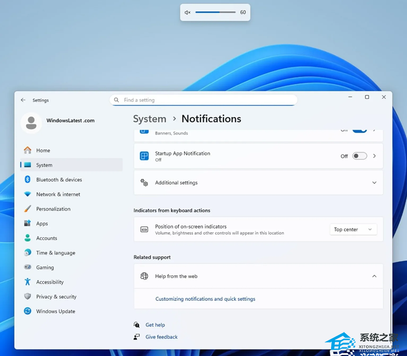 要自定义这些指示器的位置,只需前往“设置”>“系统”>“通知” 。在该部分中,滚动到“屏幕指示器位置”下的选项。默认情况下,设置将位于底部中央;但是,用户可以选择位于左上角或顶部中央的位置。