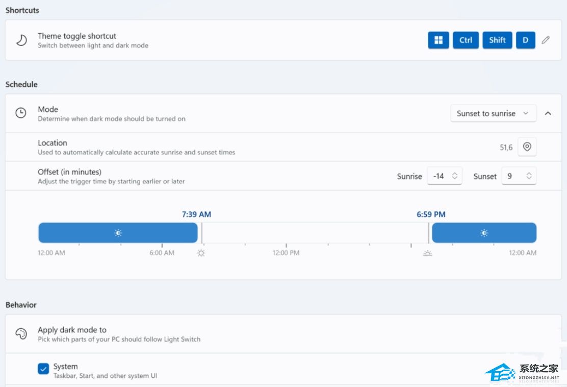 Light Switch 允许用户选择是否切换 Windows 模式、应用模式或两者都切换,并且可以配置键盘快捷键进行即时切换。用户还可以自定义切换的开始和结束时间,或者使用基于地理位置的日出和日落时间,并可以自定义偏移量。