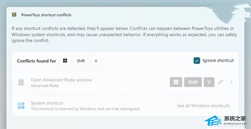 PowerToys 0.95 还增加了快捷键管理的选项,包括可以直接在冲突对话框中忽略特定快捷键冲突的功能。