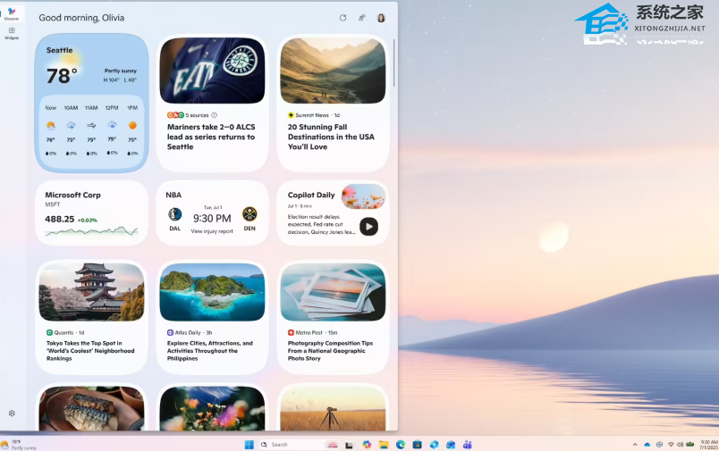 新版小组件面板(Widgets)采用了更清晰、更个性化的视觉布局,并新增由 Copilot 筛选的资讯内容,提供来自 MSN 等可信来源的摘要、视频与图片。