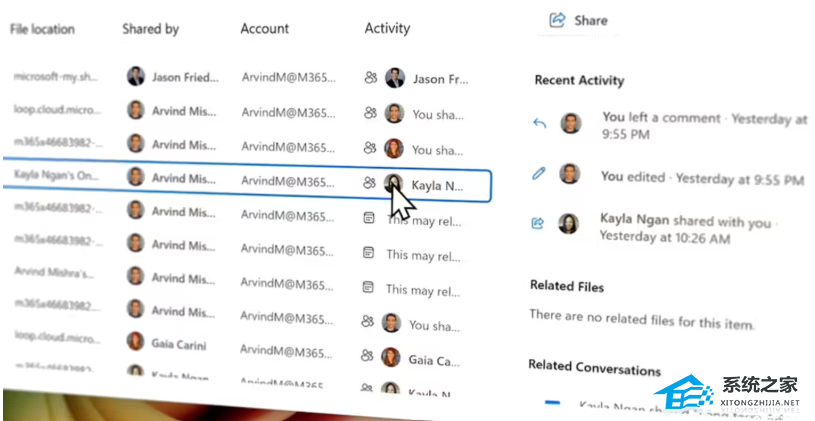 企业用户登录后,文件资源管理器首页的“推荐”和“活动”区域将显示协作者头像,悬停即可查看 Microsoft 365 联系卡,了解文件关联人员信息。