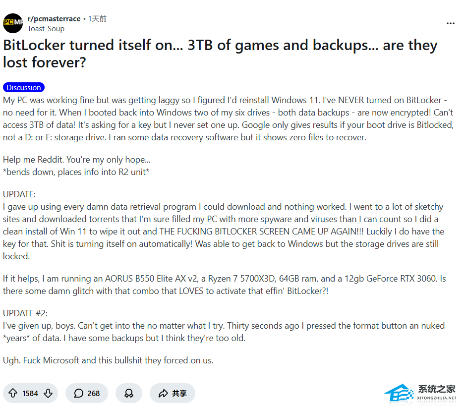 系统之家 10 月 20 日最新消息,从 Win11 开始,BitLocker 在使用微软账户登录时会默认自动启用。近日有 Win11 用户反馈,系统在未明确弹窗提醒的情况下,自动启用 BitLocker 硬盘加密功能,导致其存储重要资料的 3TB 硬盘被锁,因未提前备份恢复密钥,目前数据难以取出。