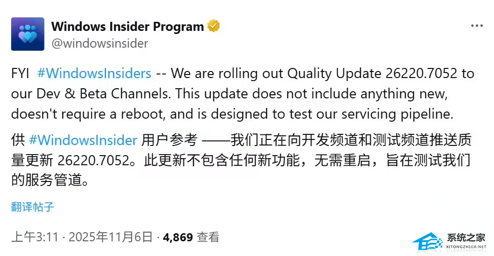 系统之家援引博文介绍,微软官方表示本次更新的唯一目的是测试其“服务管道”(servicing pipeline)。换言之,这是一次用于验证和优化微软内部更新推送流程的技术性测试,因此官方也并未像往常一样发布详细的博客文章进行介绍。
