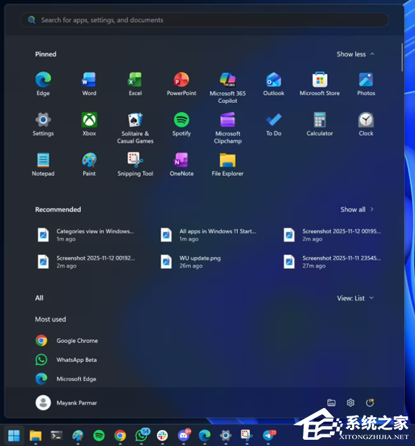 本次更新最核心的变化是开始菜单迎来了发布以来的首次重大改版。新版开始菜单采用单页布局,用户无需点击“所有应用”按钮,只需向下滚动即可浏览全部程序。